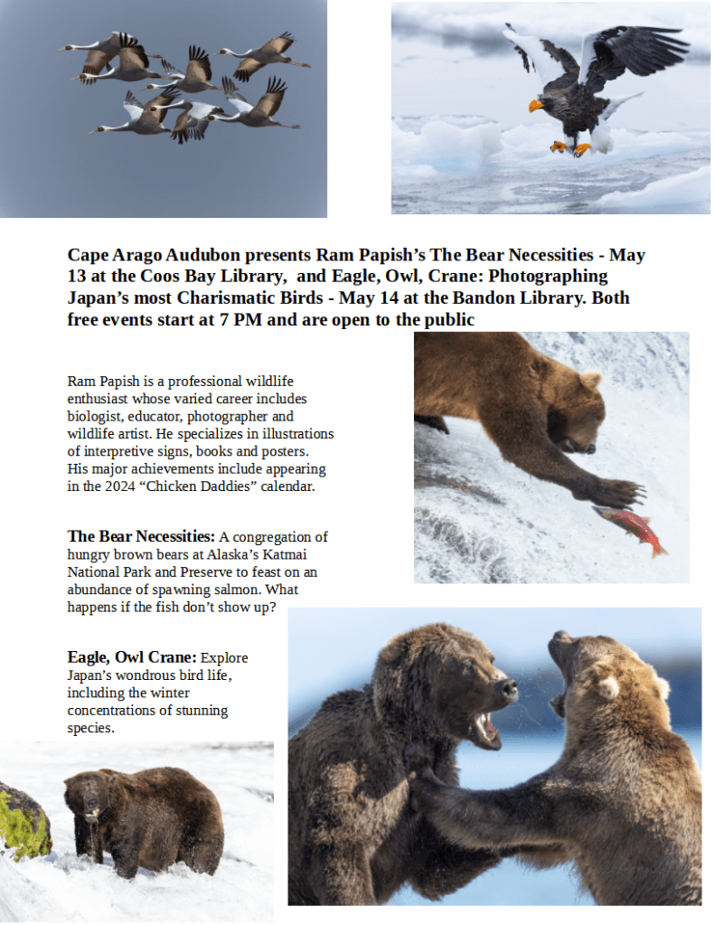 Our programs return in May and will feature the multi-talented professional wildlife enthusiast Ram Papish. Ram will present not one but two back-to-back programs next month as we try to accommodate members throughout the county. On Tuesday, May 13, Ram will present “The Bear Necessities” at the Coos Bay Library. The following evening, May 14, he travels to the Bandon library to present “Eagle, Owl and Crane: Photographing Japan’s Most Charismatic Birds”. Both programs begin at 7 PM.